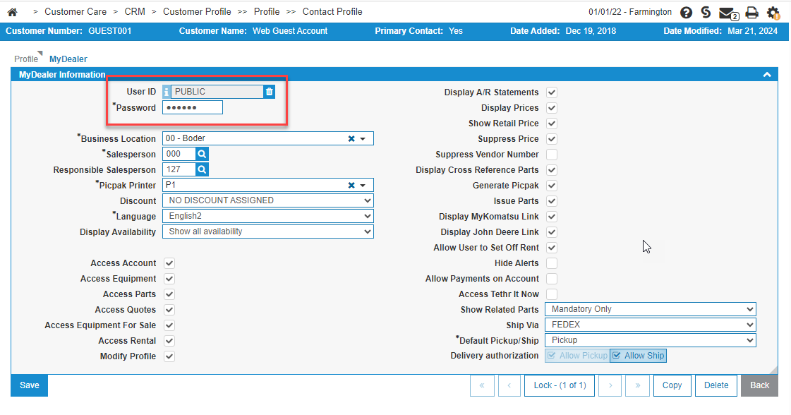 The settings on this screen determine what the guest sees (non-Shop For Parts switches are ignored). The Access: Parts switch MUST be checked.