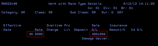 In this case we are looking at the specific rate type details for SR/SR/SR in 01/01/01 where the rate is $30.00 with a sale account of 3001050.