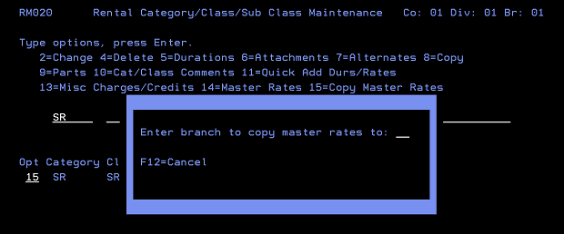 The copy master rates option (15) from the rental category/class/sub class maintenance screen will only update the rate type details screen for a specific branch for durations that don’t currently exist for that branch. The copy option adds them and uses the master rates for the details. This is typically used during initial setups.