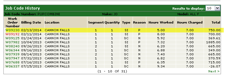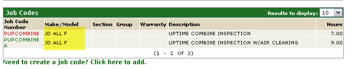 The work order will only show in the history of the job code if it matches the model of the job code: