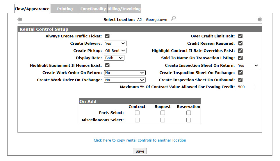 After selecting your settings on the Flow/Appearance tab for the selected location, click the Save button to the apply changes to the rental system.