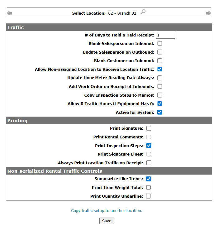 | Select Location | Setup traffic control parameters for the selected branch location. These parameters will be used throughout the traffic module for the selected location. |