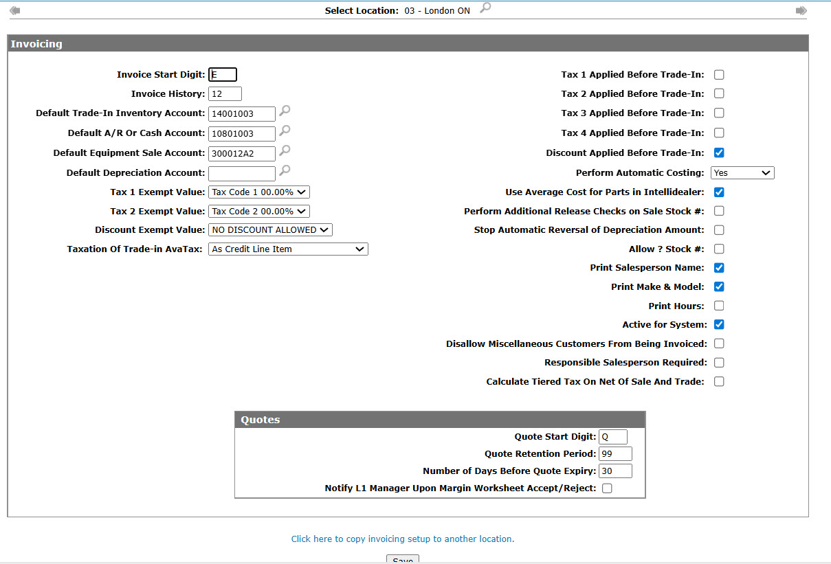 Use the Equipment Invoicing configuration screen to set up invoicing/quoting parameters by location.
