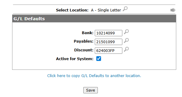 The Select Location field lists the location that the listed G/L account defaults apply to.