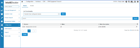 The make configuration screen can be found on the first tab of the CRM Equipment Transmit screen. This allows units to be filtered based on the equipment make associated with the unit in the Equipment Profile. Makes are shown in a list by division, as makes are configured on a division-specific basis.