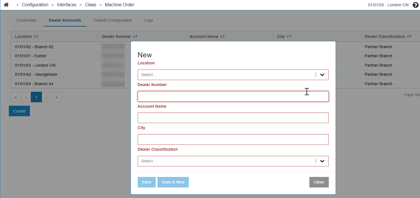 On the Dealer Accounts tab, create entries as they appear on the Claas SAP system and associate them with the system location (where equipment should be created) and the dealer number (confirmed that the dealer number is the Claas SAP Reference ID).