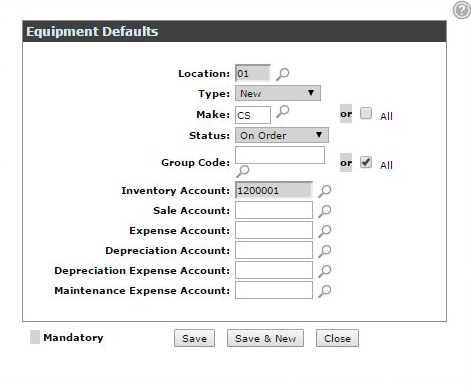 After completing the configuration process, you are now able to set up Equipment Defaults so that the interface knows which inventory account should be associated with created units.