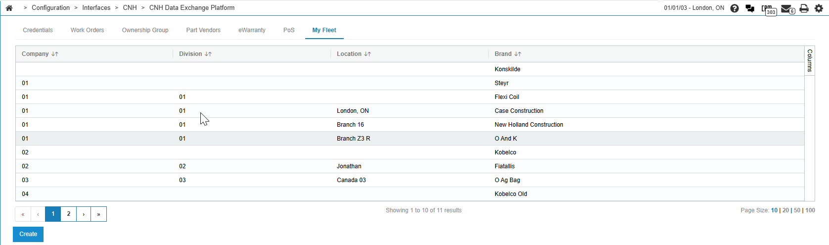 On this tab, you configure the default CNH brand used when users open CNH My Fleet. The default brand is stored per location (company, division, and branch). The grid lists each location and its default brand.