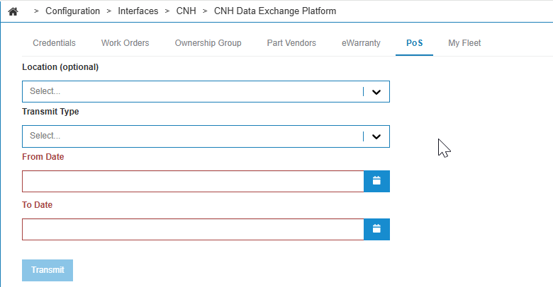 Transmit Type—select PARTS or WHOLE_GOODS to choose whether parts invoice data or equipment (whole goods) invoice data is transmitted.