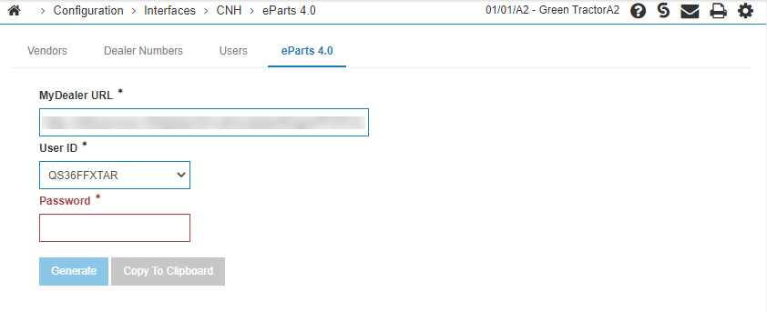 Click Generate, then click Copy to Clipboard. You will use the generated URL in the CNH Parts Catalog Setup procedure.