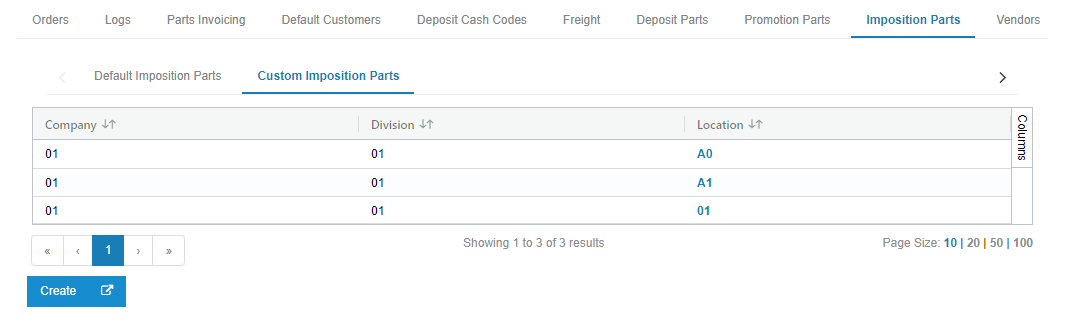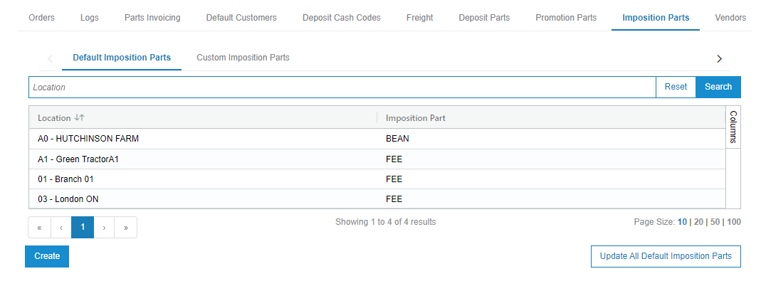 Use the Default Imposition Parts tab to configure a default part, for each location, for all possible imposition types. It is mandatory to have a default configured to process impositions that are not remitted by John Deere.