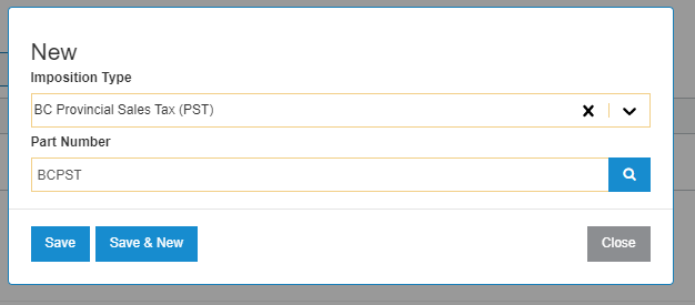 In the example below, when a BC Provincial Sales Tax (PST) imposition is received from John Deere on an order for location B1, the part number BCPST is used to post the imposition amount to the parts invoice created by the interface. If BC Provincial Sales Tax (PST) was not configured for location B1, the interface would instead fall back to the Default Imposition Part configured for location B1 on the Default Imposition Parts sub-tab.