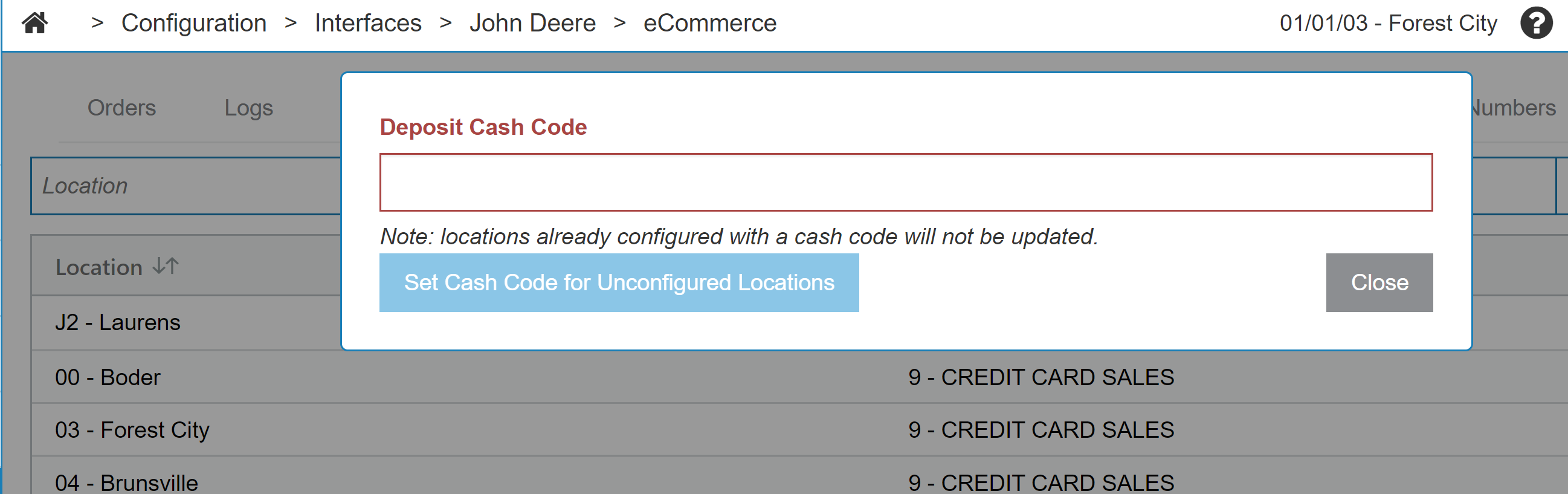 Enter a cash code in the Deposit Cash Code box and click Set Cash Code for Unconfigured Locations.