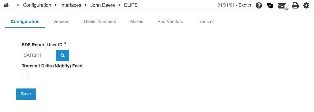 To configure the John Deere ELIPS interface, navigate to Configuration > Interfaces > John Deere > ELIPS.