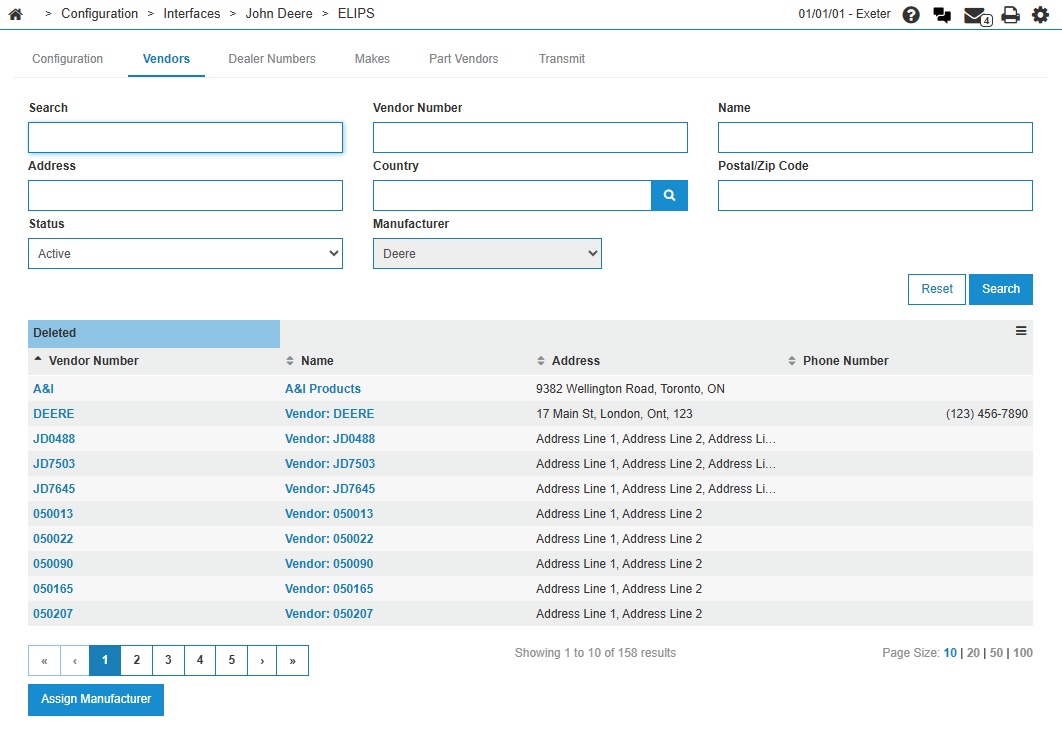The Vendors tab shows a list of vendors with the John Deere manufacturer code. If no vendors appear in the list, use the Assign Manufacturer button to set the manufacturer code on at least one Vendor.