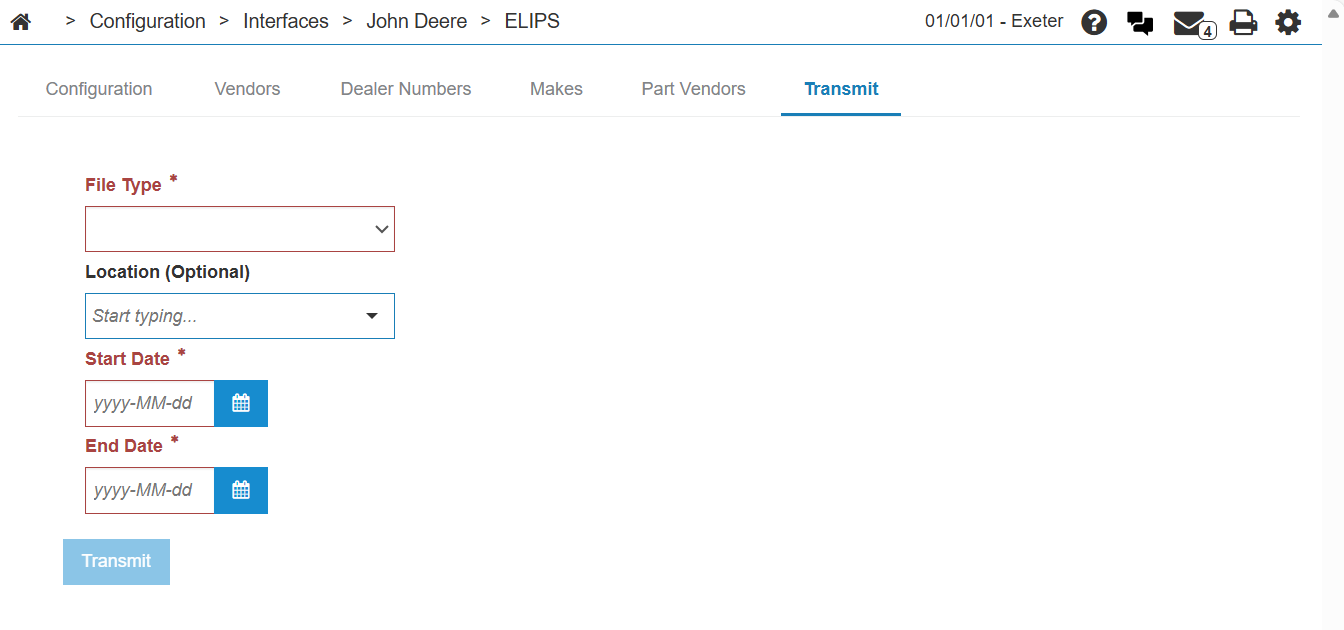 Use the Transmit tab to manually generate files and transmit them to John Deere.