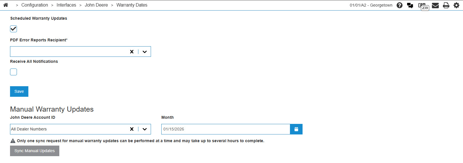 Use the Warranty Dates screen to manage how the system consumes the John Deere Warranty Date PINs API. This interface ensures equipment warranty records are synchronized with John Deere’s official database.