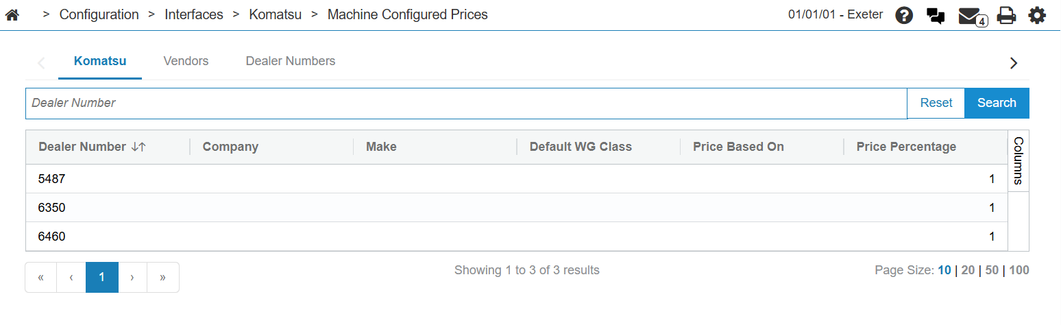 To access the Machine Configured Prices screen, navigate to Configuration > Interfaces > Komatsu > Machine Configured Prices.