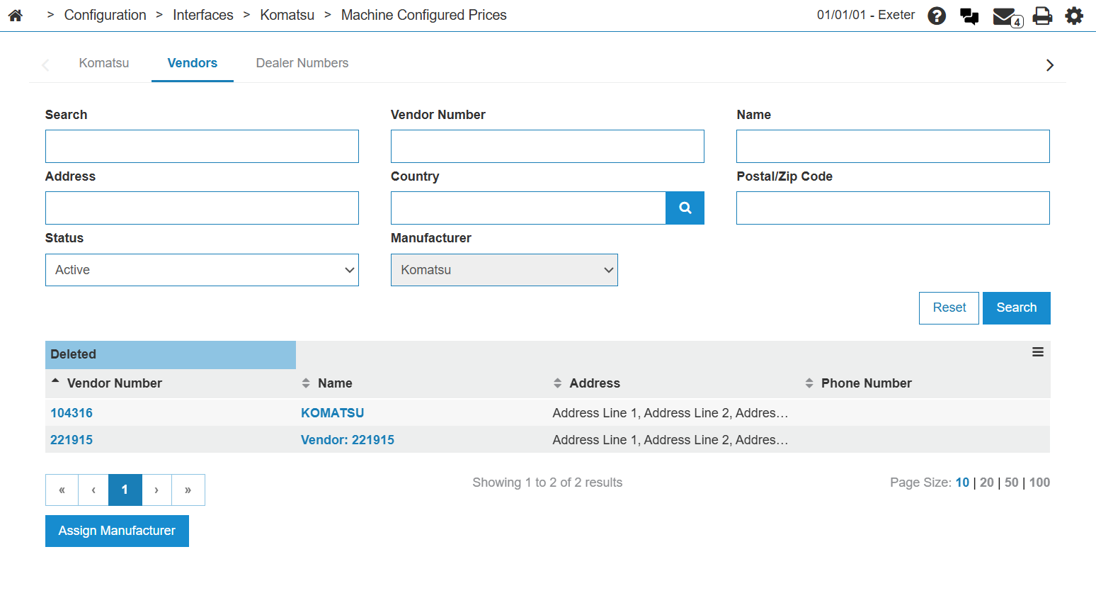 The Vendors tab shows a list of vendors with the Komatsu manufacturer code. If no vendors appear in the list, use the Assign Manufacturer button to set the manufacturer code on at least one Vendor.