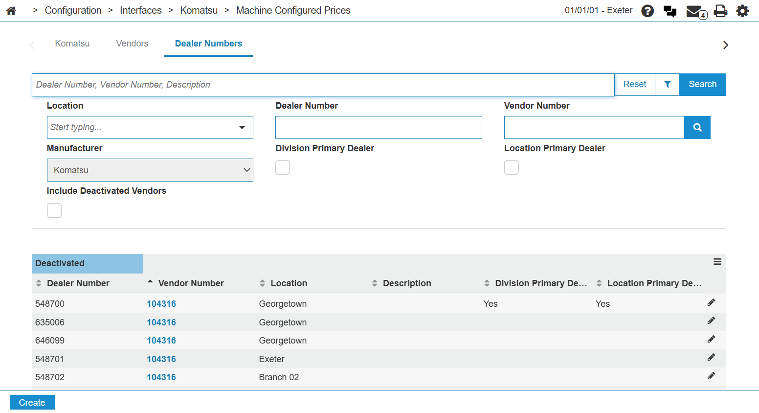Each location you wish to import Machine Configured Prices from Komatsu for must have a dealer number. You should assign a single dealer number for each location as the Location Primary Dealer, as Komatsu requires a dealer number for the file name for each location. If no Location Primary Dealer is set, the first dealer number in the database is chosen for the location to import data for.