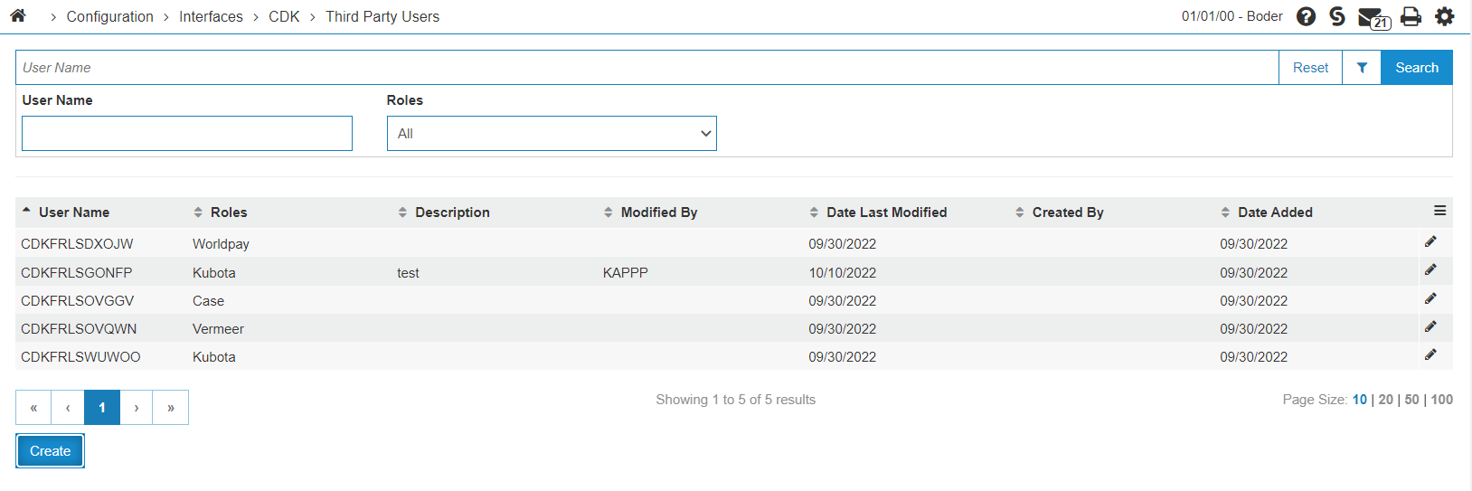 The Third Party Users screen lists users outside of IntelliDealer that are from a third-party, and is for interfaces that require a user ID and password combination to connect to the business system.