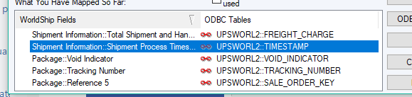 UPS WorldShip Field UPSWORL2 Field Shipment Information: Total Shipment and Handling Published Charges FREIGHT_CHARGE Shipment Information: Shipment Process Timestamp TIMESTAMP Package: Void Indicator VOID_INDICATOR Package: Tracking Number TRACKING_NUMBER Package: Reference 5 SALE_ORDER_KEY -