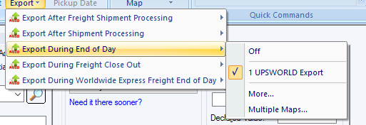 For example, to set up an automatic export during End of Day, in the UPS WorldShip application, select the export you created above from the list, or choose it from the More... option.