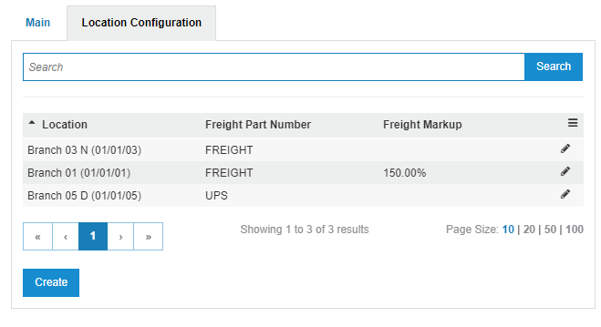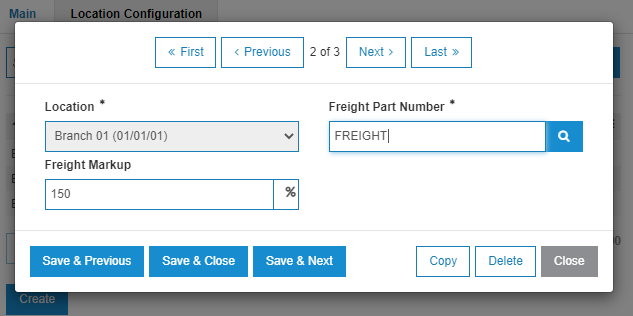 On this screen, you can configure a special part number for freight for each location in which the interface is used. If no special part is configured for freight for a particular location, the shipping information cannot be imported into a Sales Order/ Parts Requisition in IntelliDealer.