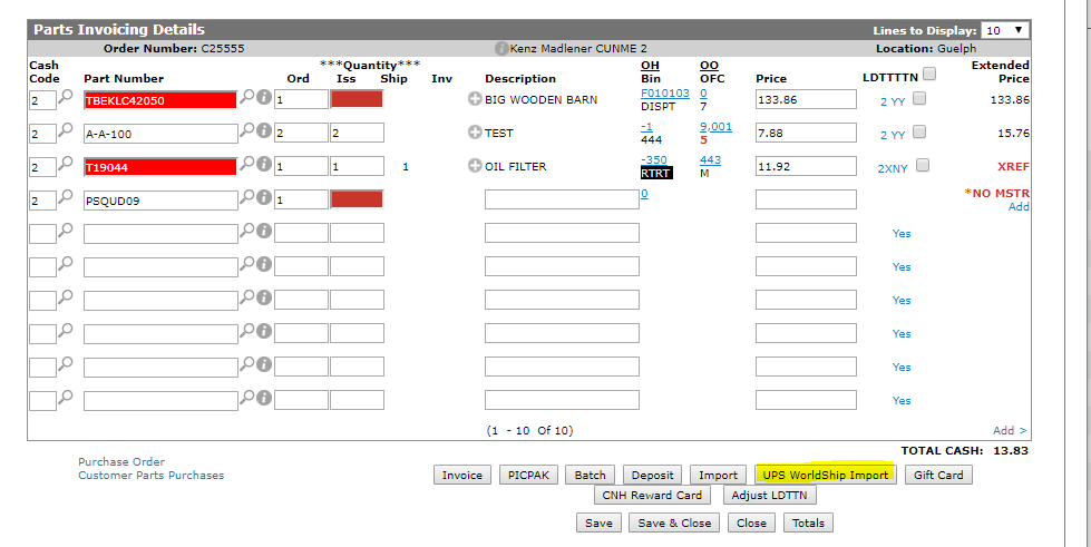 If the UPS WorldShip feature has been licensed, a UPS WorldShip Import button appears on a Parts Invoice/Sale Order.
