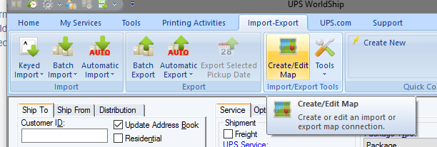 In the UPS WorldShip application, navigate to the Import-Export menu and click Create/Edit Map.