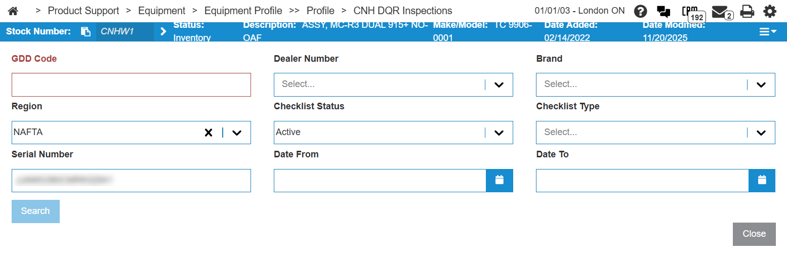 Enter your search criteria then click Search to retrieve a list of inspection checklists for the vehicle from CNH DEP.
