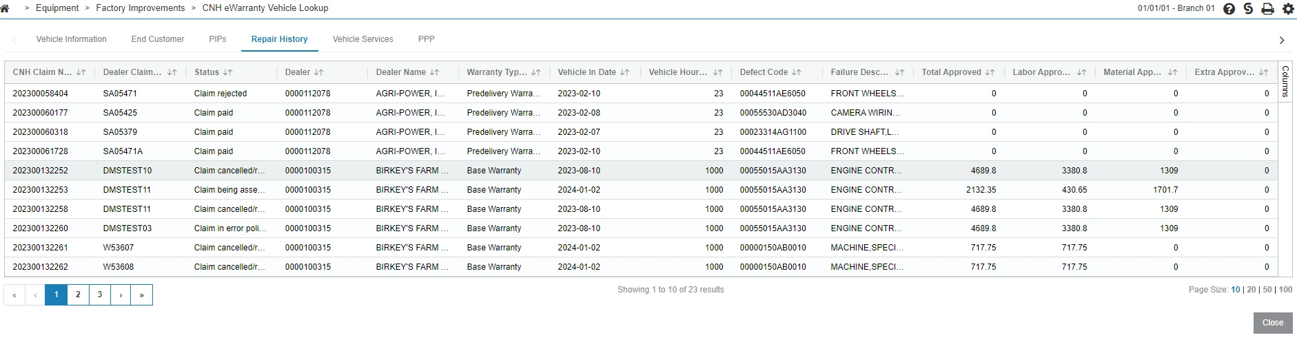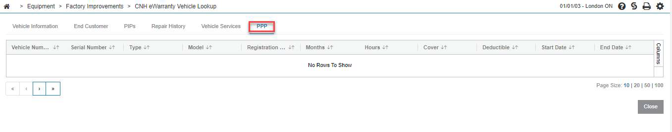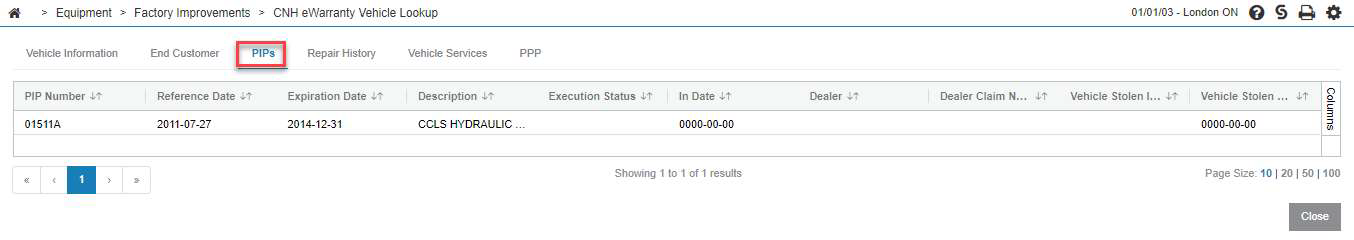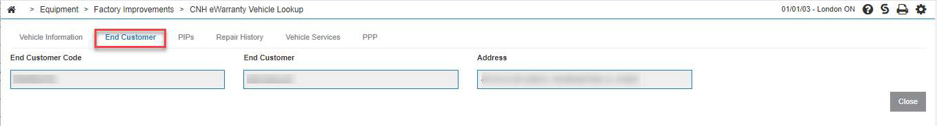 Use the CNH DEP eWarranty vehicle lookup interface to look up warranty, repair history, PIPs, and vehicle service information for CNH units. No data is written to any database files for this interface - it is a direct retrieval of information from CNH's web service.