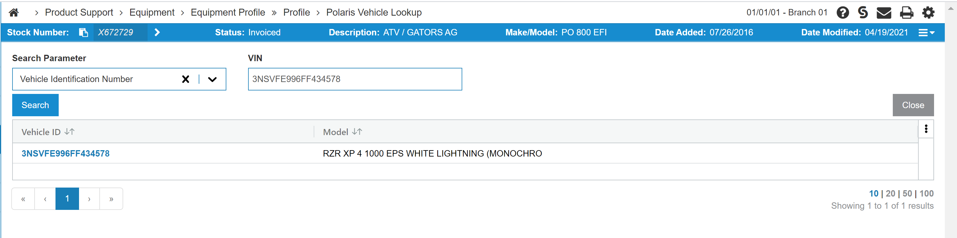 You can access this screen by clicking the Polaris Vehicle Lookup button on any one of these screens: Equipment Profile, Work Order: Segments and Work Order Quotes.