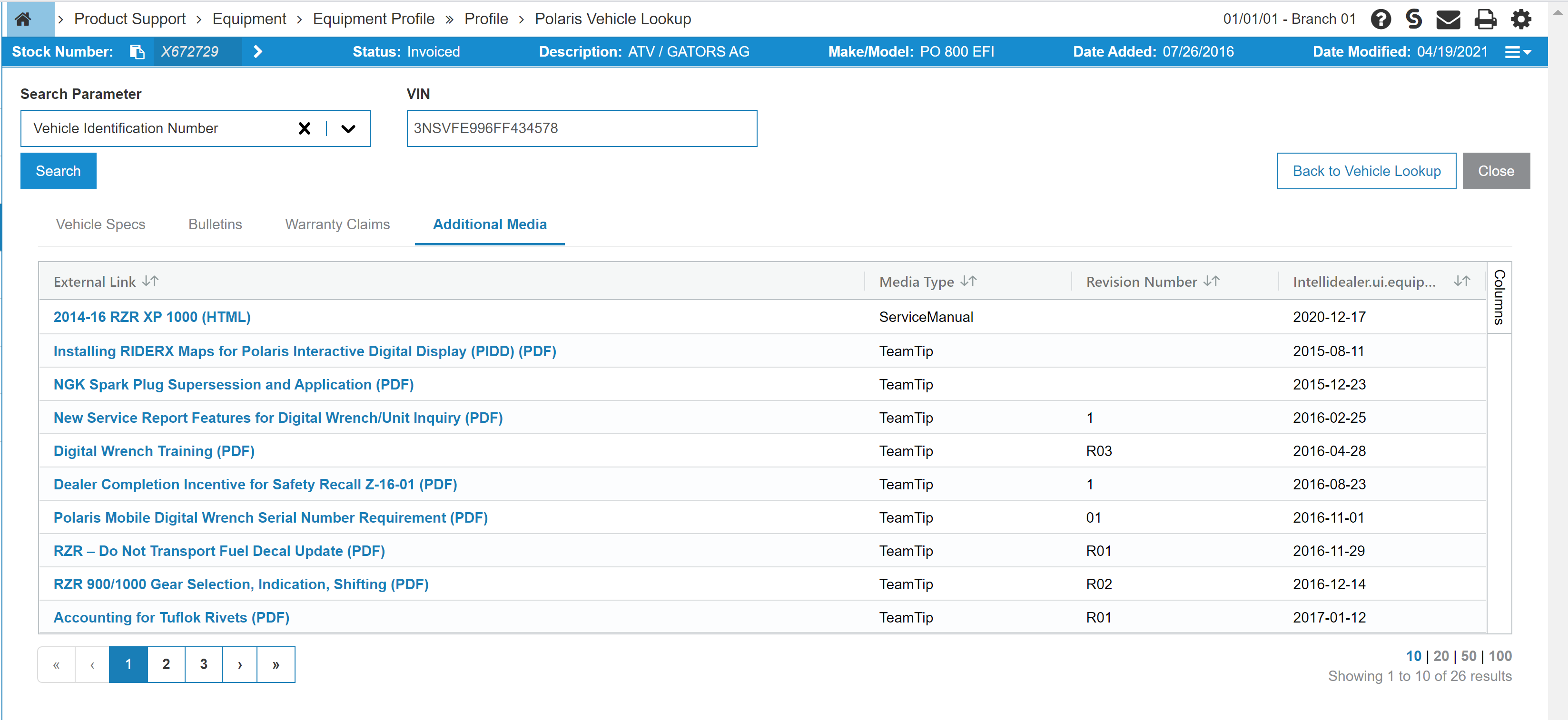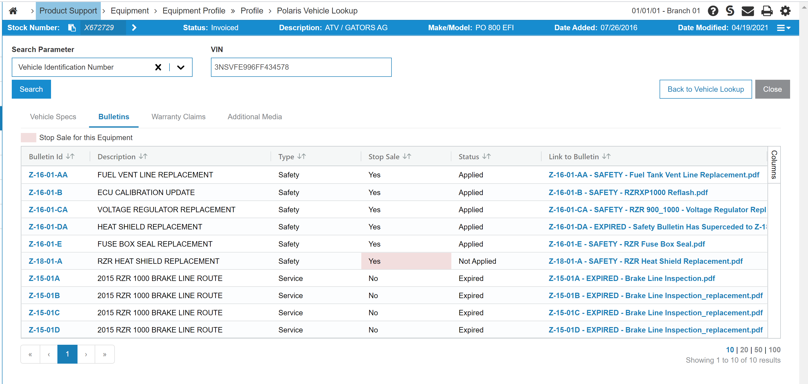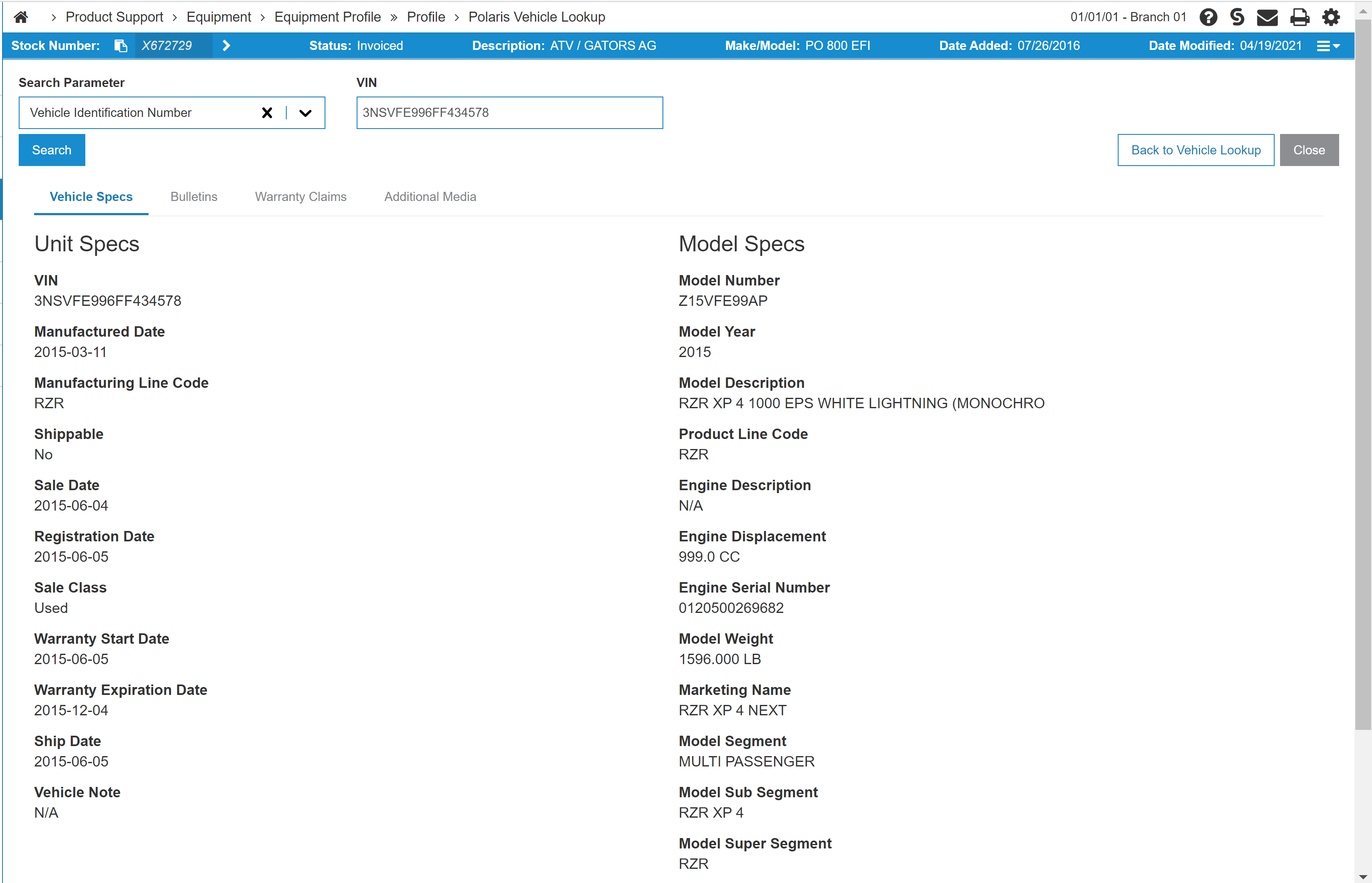 Use the Polaris Vehicle Lookup interface to view vehicle specifications, service bulletins, warranty claims, and additional media (owner manuals, product compliance certificates, etc) about Polaris vehicles. You can search for vehicles using a 17-digit Polaris VIN or an Employee Number. The default search VIN is populated as the Machine Serial Number of the equipment. Technicians that need to work on Polaris units can find links for service/safety bulletins, owner manuals and service manuals.