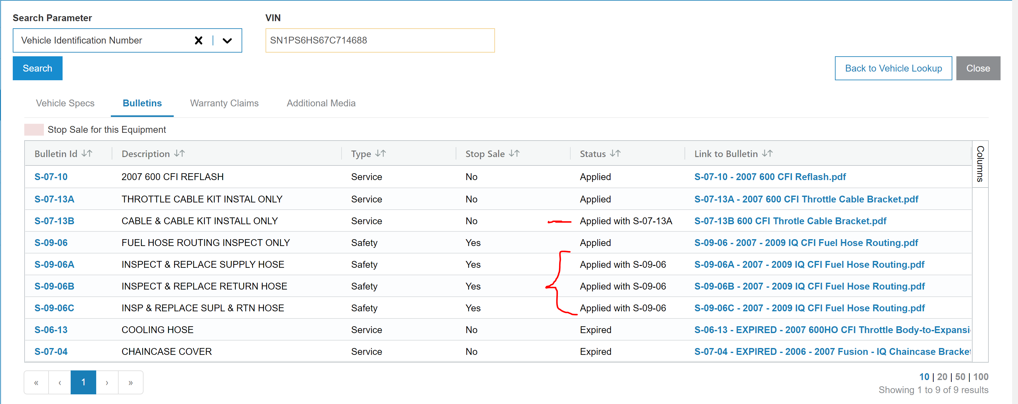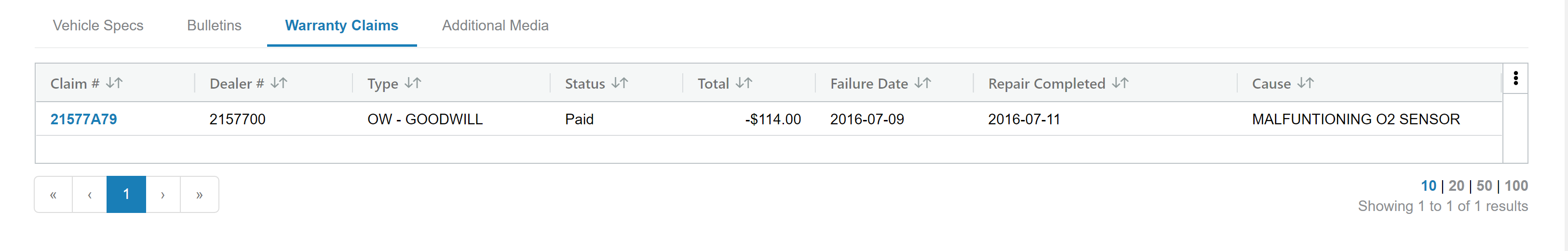 Click a Vehicle ID link to show tabs with Vehicle Specs, Bulletins, Warranty Claims and Additional Media information.