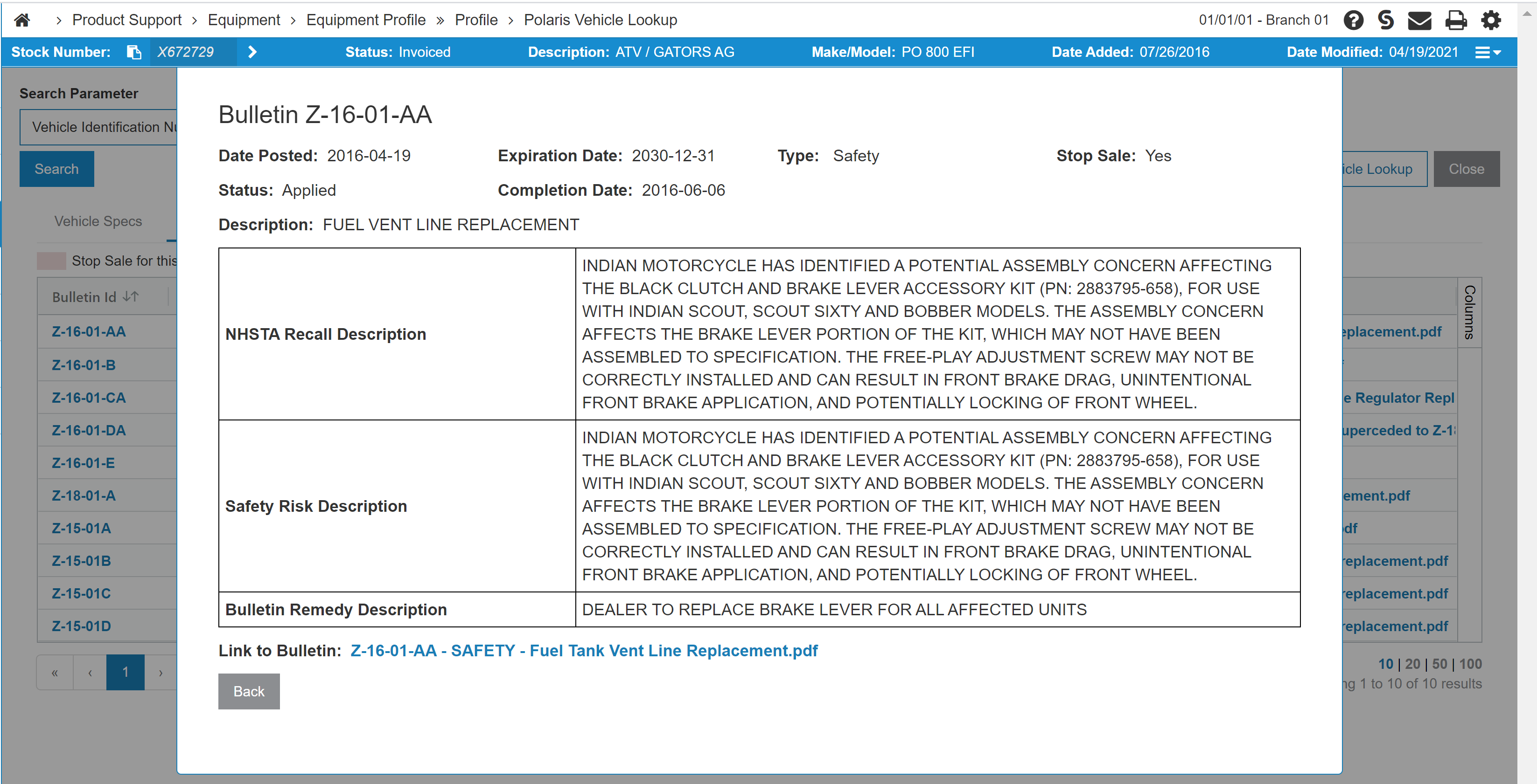 If the bulletin is a safety bulletin, the Stop Sale is true, and the status is "Not Applied", then the Stop Sale field is highlighted red to inform the user that this equipment cannot be sold until the work issued in the bulletin has been applied.