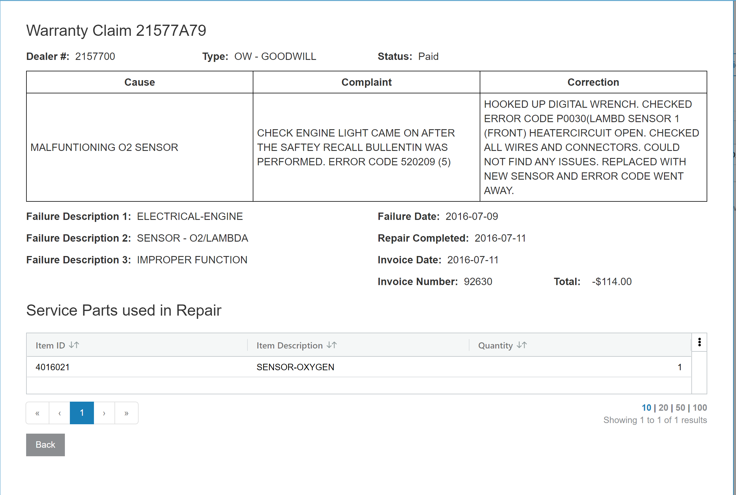 Click a Claim # to display more details about the claim and information about service parts used in the repair.