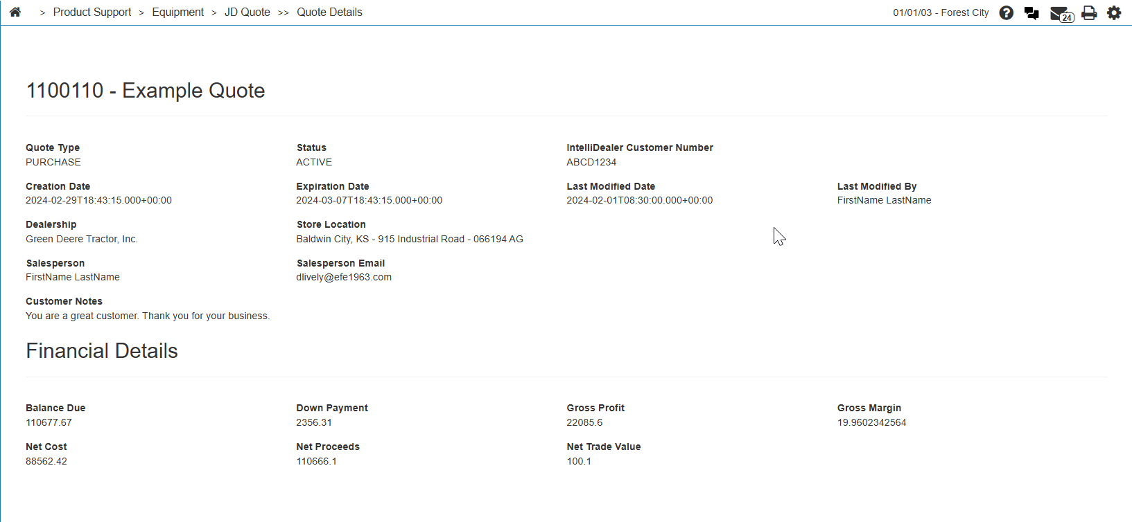 JD Quote is an interface within IntelliDealer that allows salespeople to create, manage, and track official price quotes for John Deere equipment without needing to switch to a separate John Deere portal.