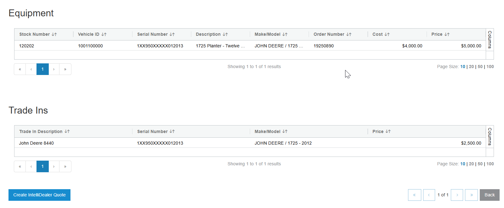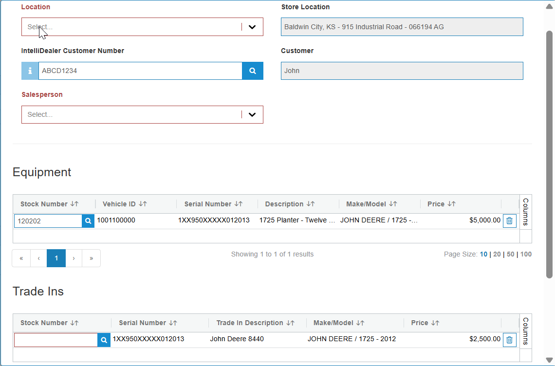 A stock number must be selected for all equipment and trade-ins that are used on the quote. If no stock number is available, a "?" character can be used instead to allow the quote to be built in IntelliDealer.