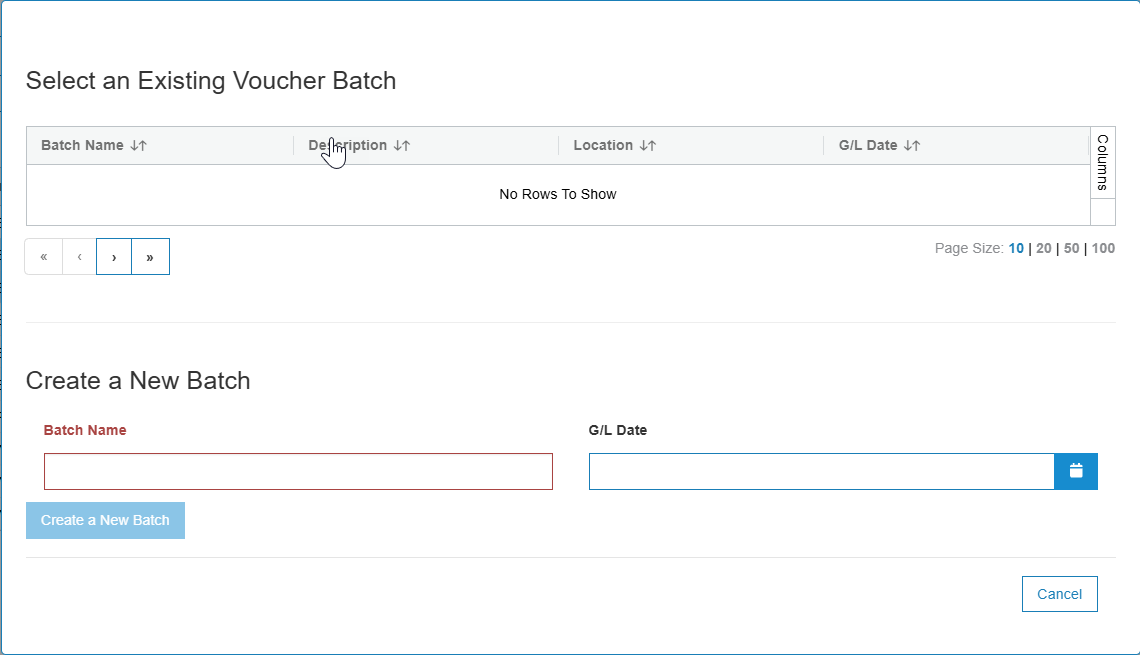 Select an existing voucher batch from the list at the top, or enter a new Batch Name and optional G/L Date to create a new one.