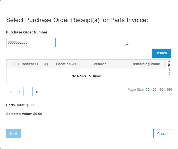 Using parts invoices requires a PO Receipt to be selected before the voucher batch. This popup appears if the system is unable to find a direct match between the Ditch Witch provided PO Number and the invoice amount. Select any PO Receipt(s) that the invoice should be applied to and click Next.