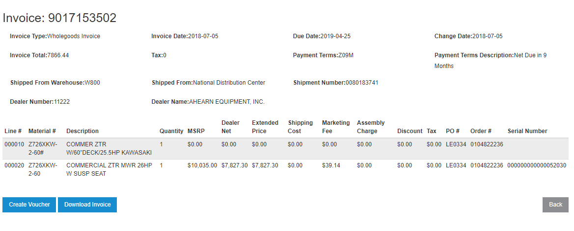 Click Download Invoice to download the original Kubota invoice in PDF format.