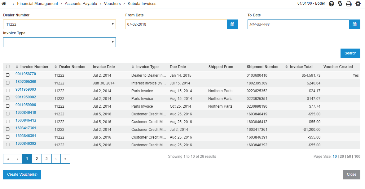 On the Kubota Invoices screen, select an invoice, then click Create Voucher, -OR- on the Invoice Details screen click Create Voucher.
