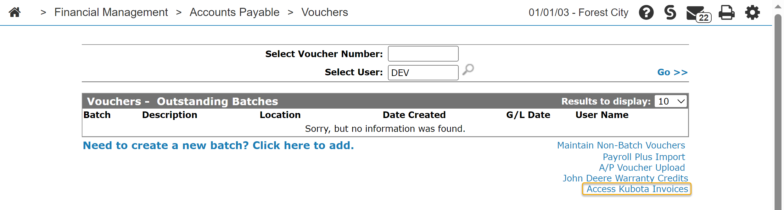 To access the Kubota Invoices screen, from anywhere in IntelliDealer navigate to Financial Management > Accounts Payable > Vouchers then click the Access Kubota Invoices link on the lower right.
